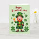 Cette carte représente un lutin joyeux vu de face sur un fond vert pâle, son large sourire et ses joues roses lui donnant un air amical et accueillant 💚. Il porte une tenue émeraude avec un haut-de-forme surmonté d'un petit bouquet de trèfles, et sa barbe rousse flamboyante encadre son large sourire comme s'il saluait quelqu'un qu'il est ravi de voir. Des trèfles et des trèfles à quatre feuilles sont dispersés autour de lui, créant un décor léger et festif qui ressemble à une journée chanceuse partagée avec des amis ☘️. Dans sa main gauche, il tient une pièce d'or brillante marquée d'un signe dollar, comme s'il partageait un petit secret sur l'emplacement du trésor. Le manteau, le gilet et le pantalon sont détaillés dans des nuances de vert, tandis que ses bottes marron se démarquent avec des lacets jaunes et une boucle dorée qui capte la lumière. Près du haut, le message « Joyeux jour de la Saint-Patrick ! » apparaît en lettres rouges, centré au-dessus de