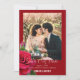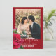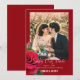 Cartes de faire-part de mariage rouge avec modèle de photo. Tout le texte est en bas, en écriture blanche et en police d'imprimerie. Les prénoms des mariés se démarquent en caractères gras, majuscules et en police d'imprimerie. Une rose rouge réaliste et un bouton de rose ornent le bord. Ajoutez une photo verticale (portrait) pour de meilleurs résultats. Choisissez également l'option de téléchargement instantané pour partager les faire-part de mariage en ligne.