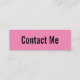 Ce mini carte de visite rose dit "contactez-moi" sur le devant du carte de visite. L'arrière contient quatre lignes de texte noir pour votre nom et vos coordonnées, telles que votre numéro de téléphone, votre adresse e-mail et/ou votre adresse de médias sociaux. Tout le texte peut être modifié ou supprimé.