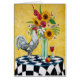 Un coq sur une nappe noire de contrôle avec un vase avec un boquet floral.