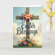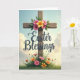 Conçue avec une croix en bois rustique au centre, la scène montre un fort grain de bois s'élevant d'une épaisse herbe verte, comme une présence stable dans un champ printanier. Là où les poutres se rencontrent, un bouquet plein se déverse vers l'extérieur, avec des fleurs roses ressemblant à des marguerites et une fleur jaune doré avec un centre orange doux nichée dans des feuilles vert foncé. Près de la base, davantage de grappes de fleurs orange et rose parsèment l'herbe, leur espacement rapproché suggérant une douce convivialité, comme des amis se penchant pour un moment partagé 🌷. Sur la partie supérieure de l'image, les mots « Easter Blessings » apparaissent en lettrage sombre et fluide, se détachant clairement sur le ciel ouvert. L'arrière-plan passe d'un bleu clair en haut à une lueur dorée chaude près de l'horizon, ajoutant une chaleur tendre et affectueuse à toute la scène 🐇. La lumière touche les pétales et les bords