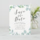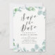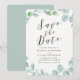 Faire-part de mariage moderne avec "Save the Date" affiché dans une écriture calligraphique gris foncé sur fond blanc. Une couronne de feuilles d'eucalyptus aquarellées dans plusieurs nuances de vert entoure vos noms, date de mariage, lieu de mariage, etc. Le faire-part de mariage eucalyptus se retourne pour afficher un fond vert sauge avec espace pour les photos et le texte supplémentaire.