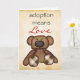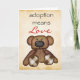 this cute adopcongratulations card is of a little frog by two flowers L'adoption est forever.