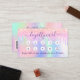 Un arrière - plan holographique branché aux couleurs unicorne et aux couleurs arc-en-ciel rose, violet, vert menthe. Décoré avec des gouttes. Sur le devant : Ajoutez-vous la remise. Retour : Personnalisez et ajoutez votre nom, titre, numéro de téléphone, courrier, adresse de site, code qr à votre site Web. Lettres violettes. Sans parties scintillant à l'arrière.