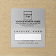 Carte de fidélité personnalisée à deux volets avec espace pour le nom de vos clients fidèles. La couleur est gris. La couleur de la police est noire. Pour customiser cette carte de fidélité, téléchargez votre logo d'entreprise, tapez votre nom d'entreprise ou d'entreprise, votre adresse, votre numéro de téléphone, votre adresse e-mail, votre site Web ou votre page de médias sociaux et la date de validité de cette carte de fidélité. Veuillez vérifier l'apparence après avoir téléchargé le logo et tapé des textes. Si l'apparence vous plaît, vous pouvez passer votre commande maintenant. Si vous avez besoin de redimensionner et déplacer le logo et les textes pour s'adapter à cette carte de fidélité ou à d'autres styles que vous choisirez, veuillez modifier l'outil de conception. Vous pouvez également effectuer d'autres modifications en fonction de vos préférences dans l'outil de conception, par exemple modifier la couleur de la carte, la couleur de la police, le style de police, ajouter une image, éditer des textes, ajouter des textes et supprimer des textes. Carte de fidélité pour vos clients afin de les convaincre de racheter dans votre magasin ou de revenir dans votre magasin pour profiter de votre service.