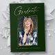 Cartes d'annonce de remise de diplôme "Photo" propres, tendance, modernes et élégantes avec feuille d'or (choix entre feuille d'or, d'argent ou rose), comportant des éléments de design de texte moderne avec une écriture calligraphique unique. La photo du diplômé sur le devant de la carte est accentuée d'une bordure partielle délicate et minimaliste. Le verso de la carte offre des espaces de texte personnalisés pour les informations sur votre remise de diplôme ou peut être vidé si vous souhaitez écrire un message à la main. Vert émeraude avec feuille d'or ou personnalisez facilement l'arrière-plan pour qu'il corresponde à la couleur principale de votre école ou à toute autre couleur de votre choix. Parfait pour les élèves de dernière année du lycée, de l'université et de l'université.