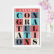 Il s'agit d'une carte de 5e anniversaire de l'employé avec le mot "FÉLICITATIONS" en noir, et avec chaque lettre dans un carré séparé dans une grille horizontale 3 x verticale 5. Les couleurs sont turquoise, bleue, pêche foncée et claire, beige. En haut de la conception est le nombre d'années en texte blanc fixé contre un arrière - plan de pêche foncé. Conception par NATALIE KINNEAR