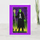 Cette carte de Halloween présente un personnage effrayant mais ludique sur le devant. Le personnage semble être un mélange entre un monstre classique et un squelette, avec un visage vert brillant semblable à un crâne et des mains vertes lumineuses. Le personnage est vêtu d'un costume noir avec un motif de cage thoracique sur la poitrine. Il tient un balai dans une main, ajoutant un élément de sorcière au costume.