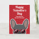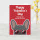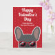 Français, envoyez à votre humain une carte de la Saint-Valentin juste de votre part. Le design présente une illustration d'un mignon bouledogue français bleu portant des lunettes de soleil rouges sur un fond rouge avec un motif de cœur subtil. Le texte sur le devant indique "Joyeuse Saint-Valentin de la part de celui que vous aimez le plus" mais peut être modifié. Le texte à l'intérieur indique "Je vous aime de tout mon cœur" mais peut également être modifié.