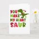 Un dinosaure vert, des cœurs roses et rouges et un texte coloré lisent : Vous faites battre mon cœur Saur.