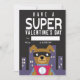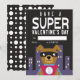 Jolie carte de la Saint-Valentin pour que votre enfant la distribue à l'école dans sa classe à ses amis. C'est une illustration d'un chien en tenue de super-héros. Il y a une skyline de ville à l'arrière. Le texte ci-dessus dit "Passez une Saint-Valentin SUPER". Vous pouvez ajouter le nom de votre enfant sur la carte et il y a un espace vide sur la carte où vous pouvez remplir le nom du destinataire.