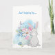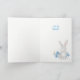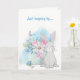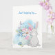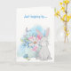 Sur le devant de cette carte de vœux pour toutes occasions figure un pot rempli de jolies fleurs printanières de tons pastel rose, bleu et vert. À côté du pot de fleurs, il y a un adorable lapin, et un papillon voltige à proximité. Le texte bleu assorti en haut dit "Juste en passant...". L'intérieur de la carte comporte une autre image du lapin assis parmi des fleurs bleues, et le texte "...pour dire BONJOUR !". Tout le texte est facilement personnalisable selon vos envies, il est donc facile d'adapter cette jolie carte à Pâques, un anniversaire ou une carte de bon rétablissement. Faites-lui dire ce que vous voulez !