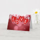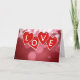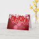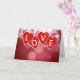 Illustration romantique avec des coeurs rouges suspendus avec des lettres "AMOUR" sur un fond bokeh.
