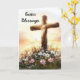 Cette carte de Pâques présente une image sereine et relevante d'une croix de bois haute au milieu d'un champ de fleurs sauvages en fleurs. La croix est éclairée par la lumière douce et dorée d'un lever de soleil, symbolisant l'espoir et le renouveau. Les fleurs, y compris les marguerites et autres fleurs colorées, apportent une touche de beauté naturelle et de joie à la scène, ce qui en fait une représentation parfaite de la saison de Pâques. A l'intérieur du côté droit : La citation inspirante est écrite à l'intérieur du côté droit, qui comprend également une photo de Jésus priant sous le texte. Citation Inspirationnelle : "Que le miracle de Pâques vous apporte foi, espoir et joie renouvelés. Je vous souhaite une belle et bénie Pâques."