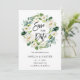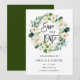 Carte de mariage à couronne florale blanche 'Save the Date' avec une couronne de fleurs blanches aquarellées et feuillage vert. Pour une personnalisation avancée de ce design, veuillez cliquer sur le bouton "Personnaliser". Des articles assortis sont également disponibles.