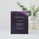 Cartes d'insertion de mariage artistiques et chic avec des traits de peinture à l'aquarelle abstraits en pourpre et bleu avec des points dorés et un texte moderne simple sur un fond noir foncé. Parfait pour les mariages chic de musée d'art moderne et de galerie d'art.