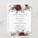 Cette carte de save the date de mariage chic présente une belle composition florale aquarelle rose et bourgogne. Conçue pour correspondre à notre collection de mariage Rustique Rose. Personnalisez-la facilement et rapidement avec vos détails, il suffit d'appuyer sur le bouton de personnalisation pour réorganiser et formater le style et l'emplacement du texte. (c) The Happy Cat Studio