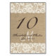 Cette carte de table de mariage personnalisée est la combinaison parfaite entre tradition et tendance. L'arrière - plan burlap est parfait pour un mariage à thème rustique ou vintage et l'accent dentelle ajoute une touche classique et romantique. Coordonnées avec la collection complète de l'assortiment Save the Dates, cartes RSVP, postage personnalisé, et plus! REMARQUE - Il s'agit d'une image de haute qualité de burlap et ruban; ce produit ne contient pas de burlap ou de ruban. Merci !