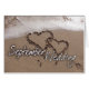 Carte de mariage de plage de destination de septembre - deux coeurs dans le sable avec des ressacs et le mariage de septembre dans la police blanche d'amusement.