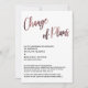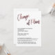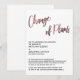 Dans une police d'écriture manuscrite moderne et audacieuse, j'ai créé un graphique indiquant simplement "Changement de plans" ; cette image a été embellie avec un effet métallisé lisse de couleur or rose. En dessous de cet en-tête se trouvent des champs de modèle pour ajouter vos informations personnelles. Tout le texte modifiable apparaît dans une police sans empattements en majuscules, en noir ; cela peut être modifié si vous le souhaitez. // 105 //