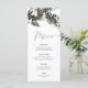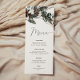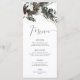 Célébrez dans le style avec cette carte rustique de menu d'hiver avec un pin d'aquarelle et eucalyptus brindille avec des fleurs de coton et élégante calligraphie manuscrite.