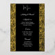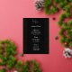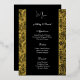 Cette carte de menu de mariage est présentée dans une élégante impression florale noire et or, écriture et texte standard de couleur blanche.
