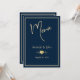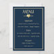 Une carte de menu de mariage classique navy et or conçue avec du texte de couleur or, des bordures et un accent en forme de cœur, sur un fond marine foncé. Pour personnaliser cette carte élégante, insérez simplement le nom des mariés, la date du mariage et vos sélections de menu de mariage dans notre modèle facile, en remplaçant le texte d'exemple. N'oubliez pas de consulter les accessoires de réception assortis, notamment : la carte de table de mariage, la carte de placement, le livre d'or de mariage et la bannière.
