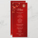 Des fleurs de cerisiers rouges et un double symbole de bonheur doré sur un arrière - plan rouge chatoyant. Avec des noms de mariée et de mariée personnalisés, la date du mariage et un texte de menu personnalisé. À l'arrière se trouvent les initiales à modifier.