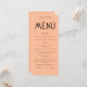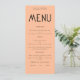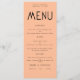 Carte de menu Mariage Peach Texte minimaliste. Disponible numériquement et imprimé. Personnalisez facilement le texte à vos propres détails qui inclut des alternatives pour vos options végétaliennes ou végétariennes. Vous pouvez changer si vous désirez des couleurs de votre choix pour correspondre à votre thème mariage.