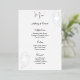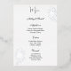 Cette carte de menu de mariage est illustrée d'une élégante impression rose en feuille d'argent et de blanc, avec une police script et un texte standard en noir.