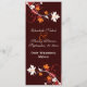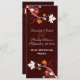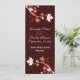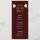 Carte de menu mariage marron rouge orange, avec de beaux feuilles d'érable rouge, orange et blanc d'automne et des tourbillons gracieux sur arrière - plan marron. Une invitation élégante et moderne, parfaite pour un mariage de automne traditionnel ou contemporain.