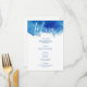 Cartes de menu mariage imprimées sur mesure avec une bordure d'aquarelle bleue abstraite pour coordonner avec notre collection Sapphire Tide. Customisez le texte avec les options du menu mariage. Utilisez les outils de conception pour modifier les polices et les couleurs ou déplacer du texte autour pour adapter vos sélections de menu. Ce design d'inspiration océanique est parfait pour un mariage de destination sur la plage !