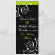 Élégante carte de menu mariage de couleur verte et fleurie, avec feuilles de défilement blanches, tourbillons, boucles et points verts citron sur arrière - plan noir. Il y a un groupe vert au sommet. Ce design chic, élégant et élégant fait partie d'un ensemble de produits en papier mariage et est parfait pour un mariage de printemps ou d'hiver.