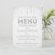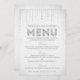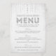 Cette charmante carte de menu conçue par The Spotted Olive™ présente un joli fond gris argenté doux avec une image de pierres précieuses ruisselant du haut et le mot "Menu" stylistiquement rempli d'une image de paillettes argentées. VEUILLEZ NOTER : CE DESIGN NE COMPREND QU'UNE IMAGE IMPRIMÉE DE PAILLETTES ; IL N'Y A AUCUNE PAILLETTE PHYSIQUE UTILISÉE OU INCLUSE ; IL N'Y A AUCUN EMBELLISSEMENT.