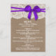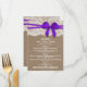 La collection rustique de mariages à arc violet est un design étonnant avec un joli arrière - plan rustique effet burlap avec un ensemble romantique vintage effet dentelle blanche et un superbe arc violet. Ces menus peuvent être personnalisés pour vos occasions spéciales et rendraient le modèle parfait pour les menus mariages, les menus de douche nuptiale, les menus de fiançailles, les menus de fête d'anniversaire et bien plus encore. *Veuillez noter que Zazzle ne vend que des produits imprimés, de sorte que cet article n'a pas de véritables boucles, dentelles ou rubans/archets.