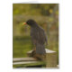 La carte avec la photo d'un merle était perché sur un poteau de barrière de jardin sous la pluie.