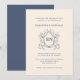 le design montre une invitation de mariage classique et élégante en calligraphie et typographie bleu poussiéreux et une crête florale au milieu avec des initiales de couple à l'intérieur. Ce design est extrêmement classe et sera un choix unique et classique pour votre mariage.