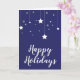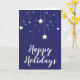 Une belle carte pour vos cartes de fin de année d'entreprise ou d'affaires. Design moderne et classique bleu et blanc avec étoiles blanches suspendues au sommet de la carte. Le texte à l'avant est comestible. Faites-le Joyeux Noël, Joyeux Fêtes, Joyeuses Fêtes, etc. dans une typographie élégante. À l'intérieur comprend un message que vous pouvez personnaliser et le nom de votre entreprise ou de votre entreprise. Objets correspondants disponibles dans notre magasin.