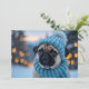 Cette adorable carte de Noël présente un carlin mignon portant un casquette tricot bleu et un foulard, posé sur fond de lumières scintillantes et de paysage enneigé. Cette image qui fait chaud au coeur est parfaite pour répandre la joie des fêtes et apporter un sourire aux visages des amoureux de les chiens comme des amateurs de Noël.