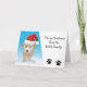 Une mignonne carte de Noël Cockapo dans une scène de neige avec un chapeau de Père Noël.