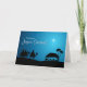 Carte de voeux de Noël avec la scène de la nativité à Bethléem, les trois sages sur les chameaux guidés par l'étoile, Marie, Joseph et bébé Jésus dans une crèche, entourés d'animaux. Vous pouvez personnaliser cette carte avec votre propre texte personnalisé.