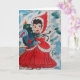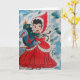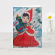 La veille de Noël est la période la plus chargée de l'année pour le Père Noël, il a donc besoin d'autant d'aides volontaires qu'il peut en obtenir. Dans cette charmante carte de vœux festive, l'un des principaux assistants du Père Noël rassemble des cadeaux et un sapin de Noël avant le grand jour. Vêtu d'un costume de velours écarlate saisonnier taillé dans de la fourrure, c'est une image festive amusante et colorée pour les fêtes.