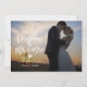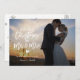 Carte de Noël moderne avec les mots "notre premier Noël en tant que M. et Mme" dans un script manuscrit moderne avec votre photo affichée derrière. Le verso de la carte présente de faux flocons de neige en paillettes argentées.