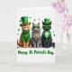 Cette carte représente trois chats élégamment habillés debout côte à côte sur un fond blanc éclatant, avec de petits trèfles verts dispersés autour d'eux pour une atmosphère de Saint-Patrick 💚. Sur la gauche, un chat tigré orange porte un haut-de-forme vert avec une boucle dorée et un sweat à capuche vert, ses yeux dorés tournés légèrement vers les autres comme s'il partageait une plaisanterie discrète. Au milieu, un chat gris duveteux arbore des lunettes de soleil carrées vertes et un pendentif en forme de cœur doré, se penchant vers la ligne avec une fraîcheur calme et amicale. Sur la droite, un chat noir élégant assortit les accessoires verts avec un gilet vert bordé de boutons dorés brillants et un nœud papillon soigné, donnant au trio une proximité pour la photo. Les verts ressortent fortement sur le fond blanc, et l'éclairage doux fait ressortir la texture de la fourrure et l'aspect tricoté des vêtements ☘️. Centrée sous les chats, la phrase « Joyeuse Saint-Patrick » apparaît en lettres vertes,