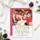 La carte de photo de vacances comporte un texte en calligraphie moderne "Joyeux Noël" en or antique avec des accents de design de baie de houx vert et rouge. Personnalisez le message "et bonne année" et les noms des membres de la famille avec votre libellé personnalisé. Des pois abstraits habillent l'arrière de la carte. Personnalisez la couleur de fond rouge festive pour coordonner avec votre photo !