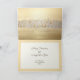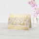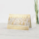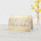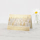 Des pins de Noël dorés et argentés défilent au-dessus d'un arrière - plan blanc enneigé dans cette aquarelle stylisée. Vintage (faux) or accentue la scène au-dessus et au-dessous, ce qui donne une très belle image. A l'intérieur de cette carte de vacances pliée est un motif assorti de pins. Et il y a un texte modifiable avec le message de bienvenue "Joyeux Noël et Bonne Année". Assurez-vous de modifier l'exemple "de" noms et année.