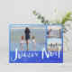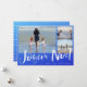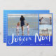 Joyeux Noel Carte de voeux de Noël française dans un design de trois photos à l'ombre bleue sur la plage. Customisé avec trois de vos photos et le nom de votre famille. Cette carte de Noël de plage revient à un dessin à rayures bleues et blanches sur le dos.