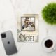 Ajoutez votre photo préférée à ce cadre en feuille d'aluminium sur fond vert forêt assourdi avec des coups de pinceau dorés abstraits modernes. Une police contemporaine en véritable feuille d'aluminium écrit Noel et juste au-dessus en écriture cursive se trouve Joyeux. simple et élégant