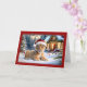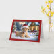 Sur le devant de cette carte de Noël, on peut voir une image charmante d'un jeune lionceau allongé dans la neige, portant un chapeau festif de Père Noël. Le petit regarde vers l'avant avec une expression curieuse et innocente, entourée de décorations de vacances. Dans l'arrière - plan, un cabine douillet est orné de lampes et de couronnes de Noël, encadrées d'arbres enneigés, donnant à la scène une ambiance pittoresque de pays des merveilles hivernales. Le texte "Joyeux Noël" est affiché en haut dans une police élégante et classique, ajoutant à l'esprit festif. La bordure de la carte est d'un rouge profond, rehaussant l'atmosphère de vacances et faisant ressortir l'image encore plus. Cette carte serait parfaite pour les amoureux des animaux et ceux qui aiment une approche amusante et chaleureuse des cartes de fin de année traditionnels. Il transmet un message de chaleur, de joie et d'émerveillement de Noël dans la nature.