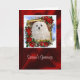 Cette jolie carte de Noël présente Snowdrop, un doux petit chien maltais. Son image est contenue dans un cadre doré orné de fleurs rouges de Poinsettia et de verdure.